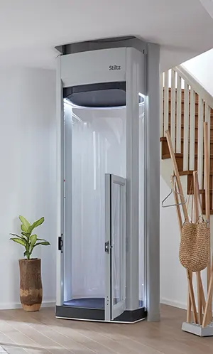 Stiltz Trio+ is a free-standing, self-supporting lift with no visible hoist and no noisy motor. It offers quiet travel, fast installation, and is designed for larger spaces, including wheelchair access.